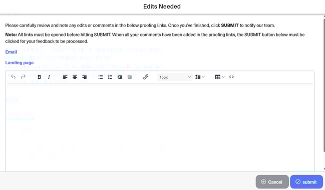 Once our team has received your content and reviewed it, you will receive a link back to the app with instructions on how to view your proofs and communicate changes.